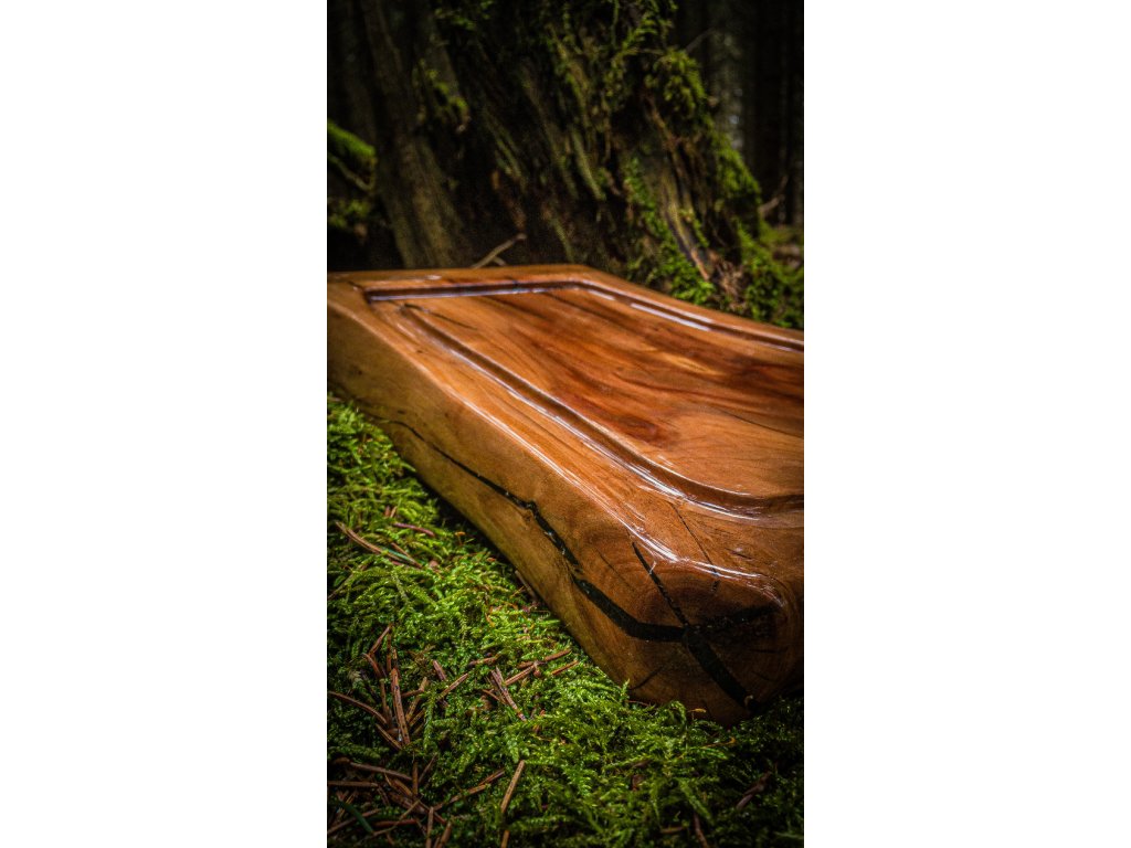 Luxusní servírovací prkénko z masivní švestky a olivového dřeva, zalité pryskyřicí. S odtokovým žlábkem, nožičkami a lesklým povrchem pro stylové stolování.