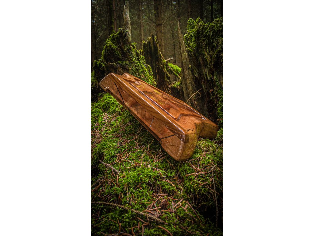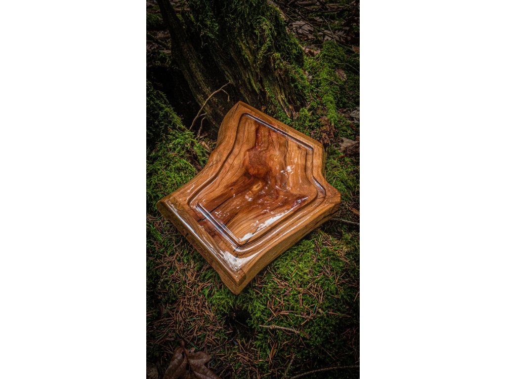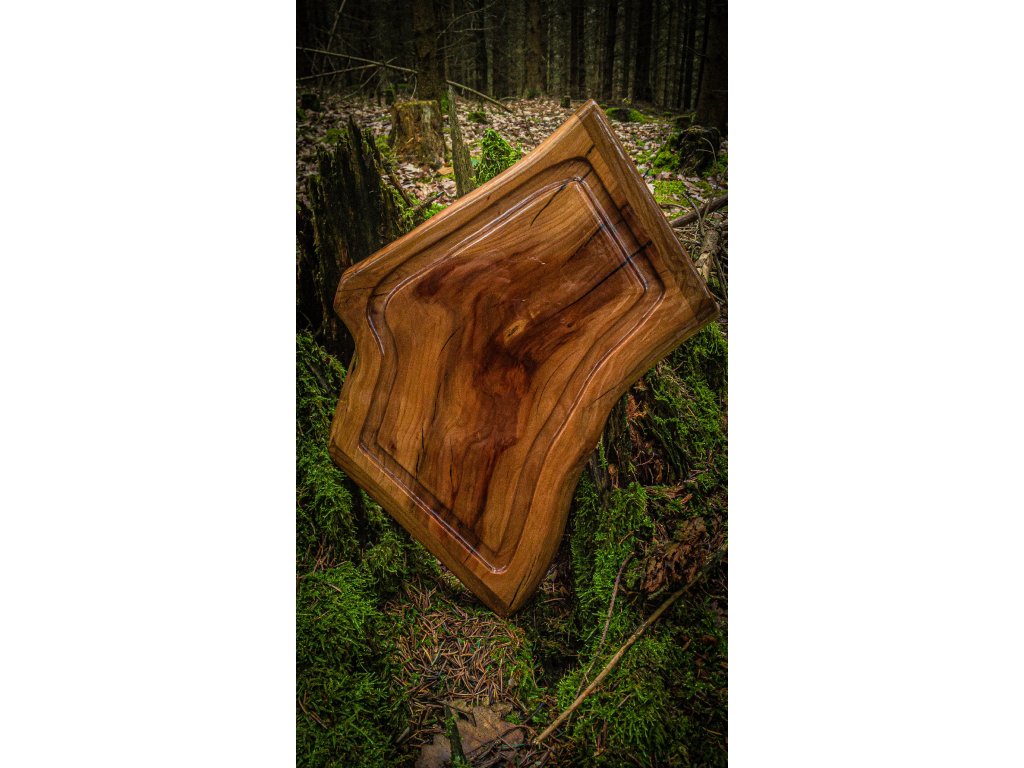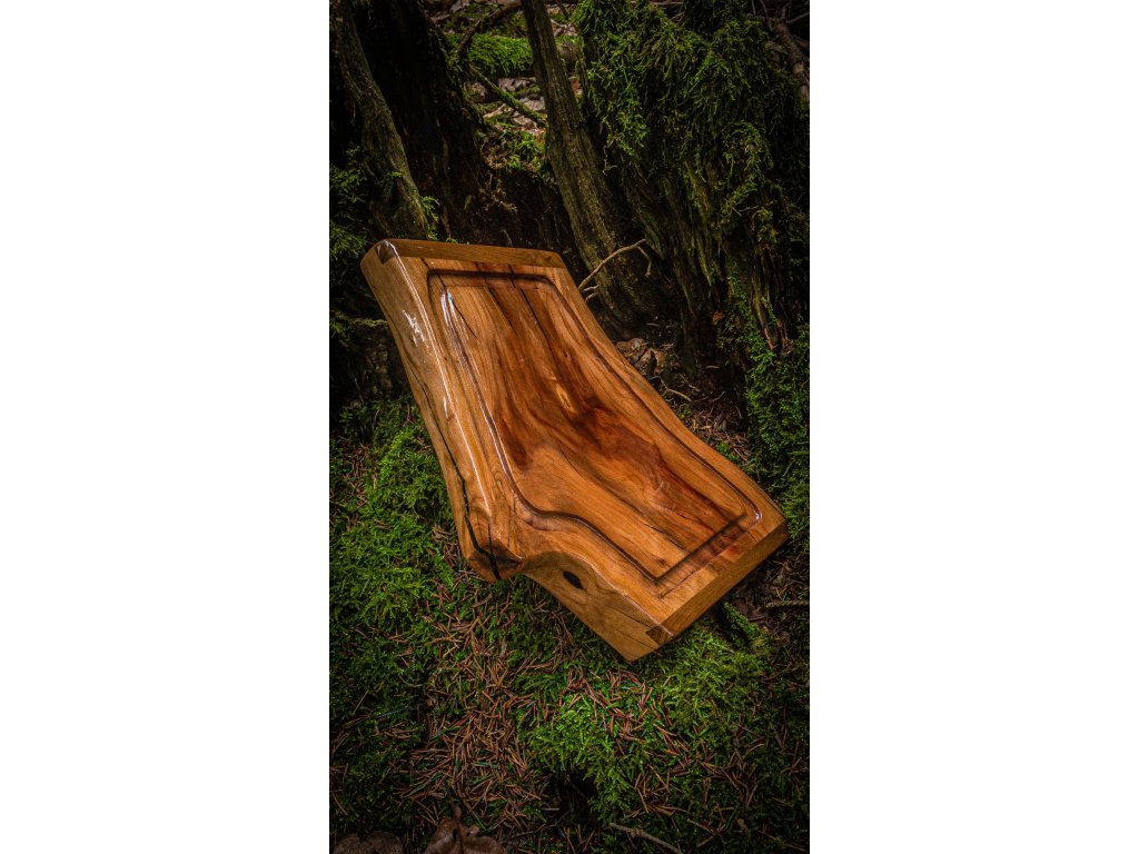 Luxusní servírovací prkénko z masivní švestky a olivového dřeva, zalité pryskyřicí. S odtokovým žlábkem, nožičkami a lesklým povrchem pro stylové stolování.
